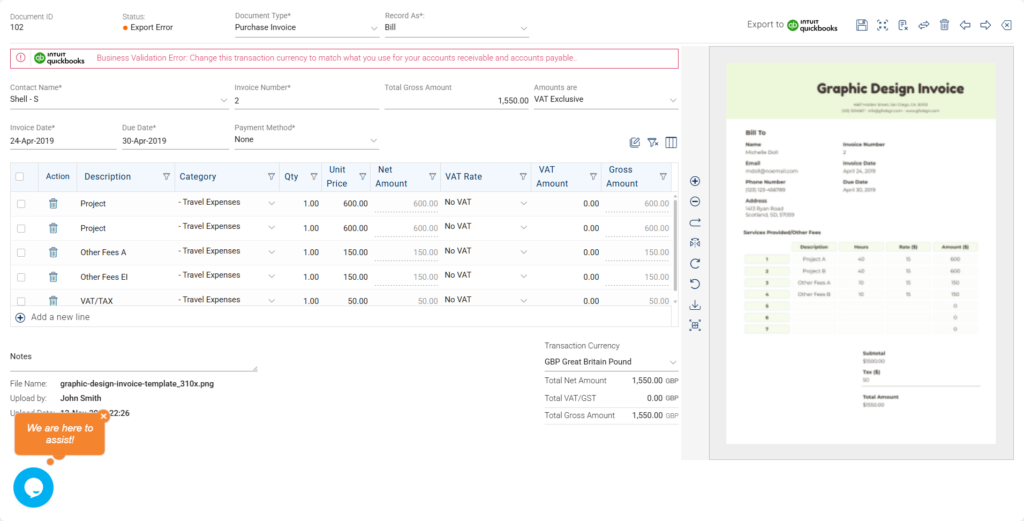Step 3 – Review the extracted data and click the “Save & Export to QuickBooks” button.
